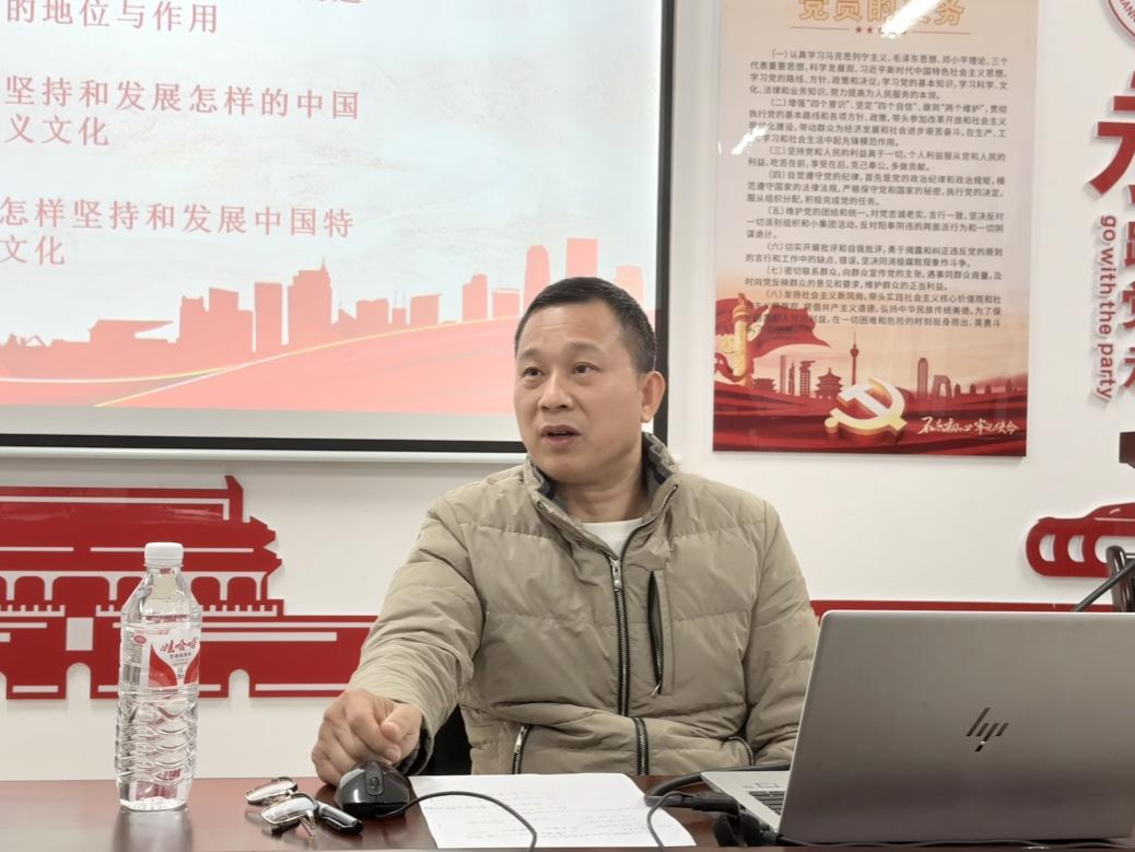 于2024年12月17日在2号实验楼B314教室为学院入党发展对象开展以“坚定文化自信,不断培育和创造新时代中国特色社会主义文化——深入学习领会习近平文化思想”为主题的专题党课,本次党课由学院党委书记磨有积老师主讲。