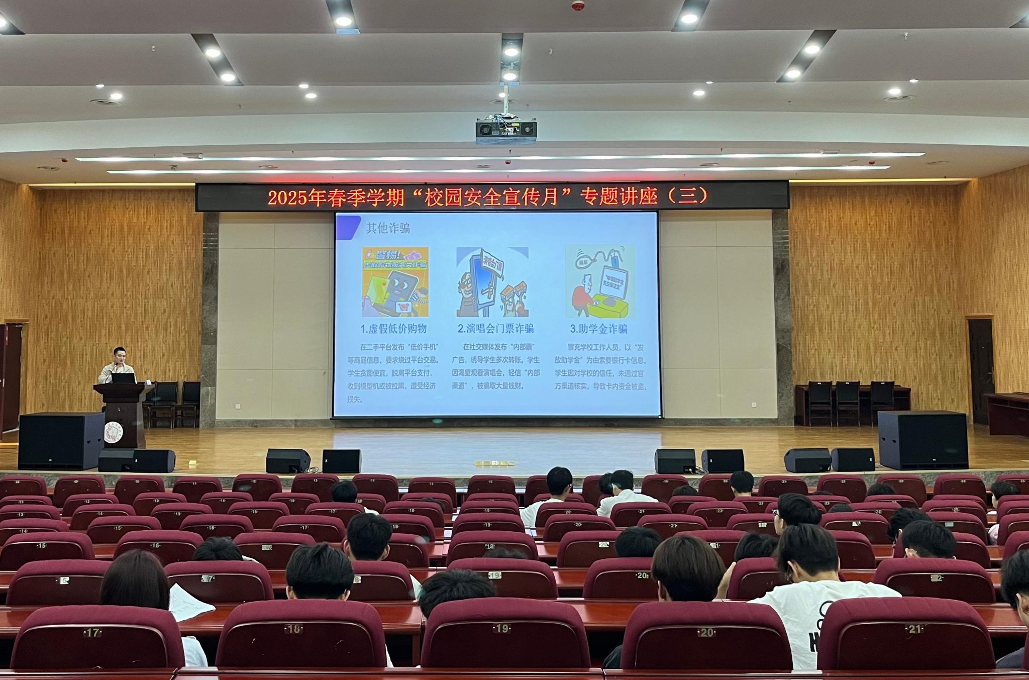 于3月25日在武鸣校区图书馆会议厅举办“校园防范电信网络诈骗——警惕陷阱,守护安全”专题讲座。本次讲座由南宁市公安局民警陆阳警官主讲,辅导员于宇航老师及2024级全体学生共300余人参与。