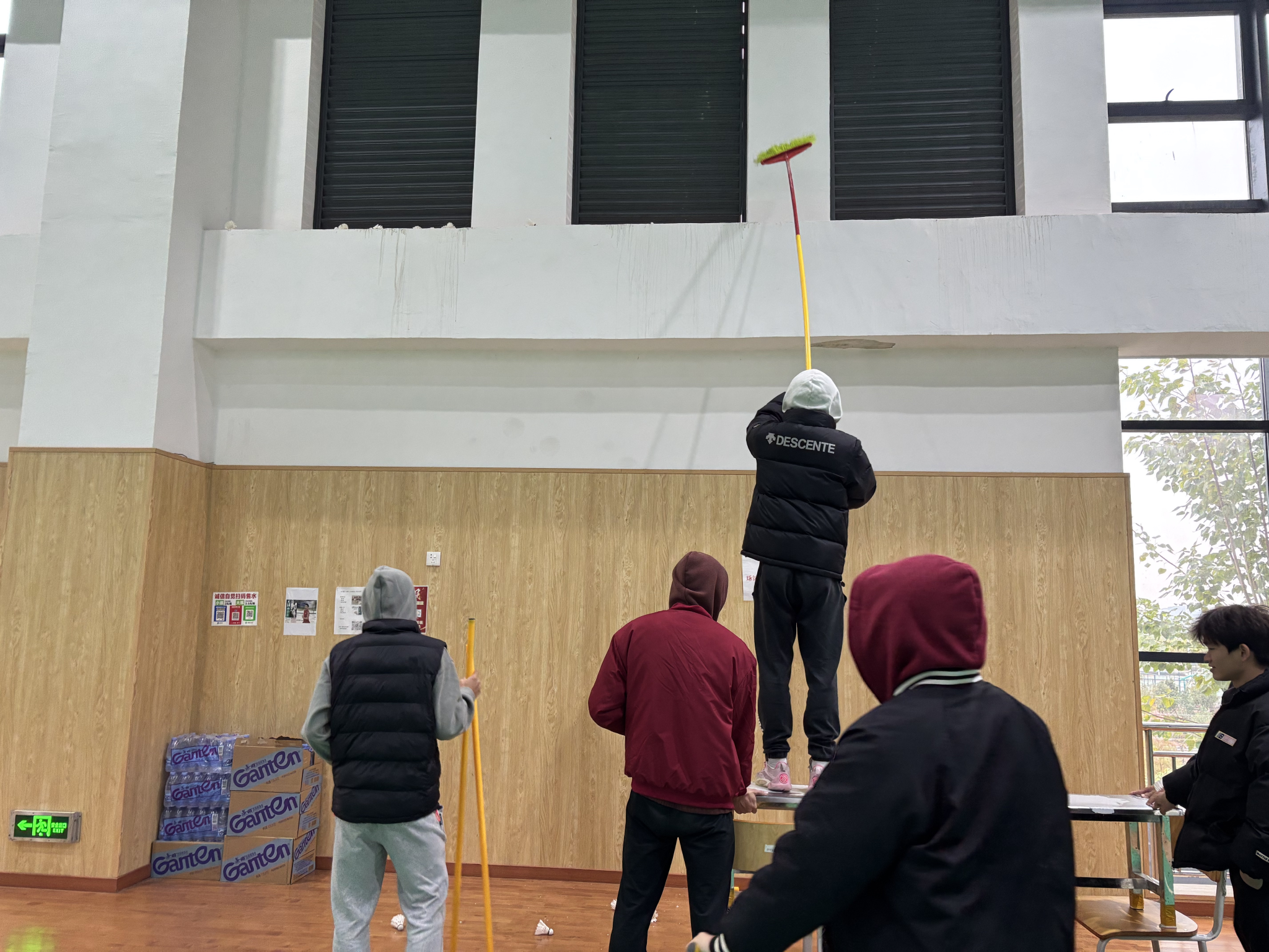在老师的组织下,本次服务型劳动活动有序进行。各班同学被分为三个队伍,第一个队伍主要负责体育馆内羽毛球场的清洁整理,小组成员相互配合,高效率的完成对羽毛球场地面、墙壁等的清理,清理高处的羽毛球;第二个队伍负责室外运动场的打扫,包括田径场和室外篮球场等场地,捡拾绿化带里的纸屑、胶带、果皮等杂物。第三个队伍负责对排球场进行全面整理和打扫。劳动的过程中,同学们团结互助、分工明确,所有工作井然有序进行,充分发扬体院学子吃苦耐劳、积极向上的精神风貌。每位同学在劳动过程中充满热情,经过大家的努力,体育馆和运动场的环境焕然一新。