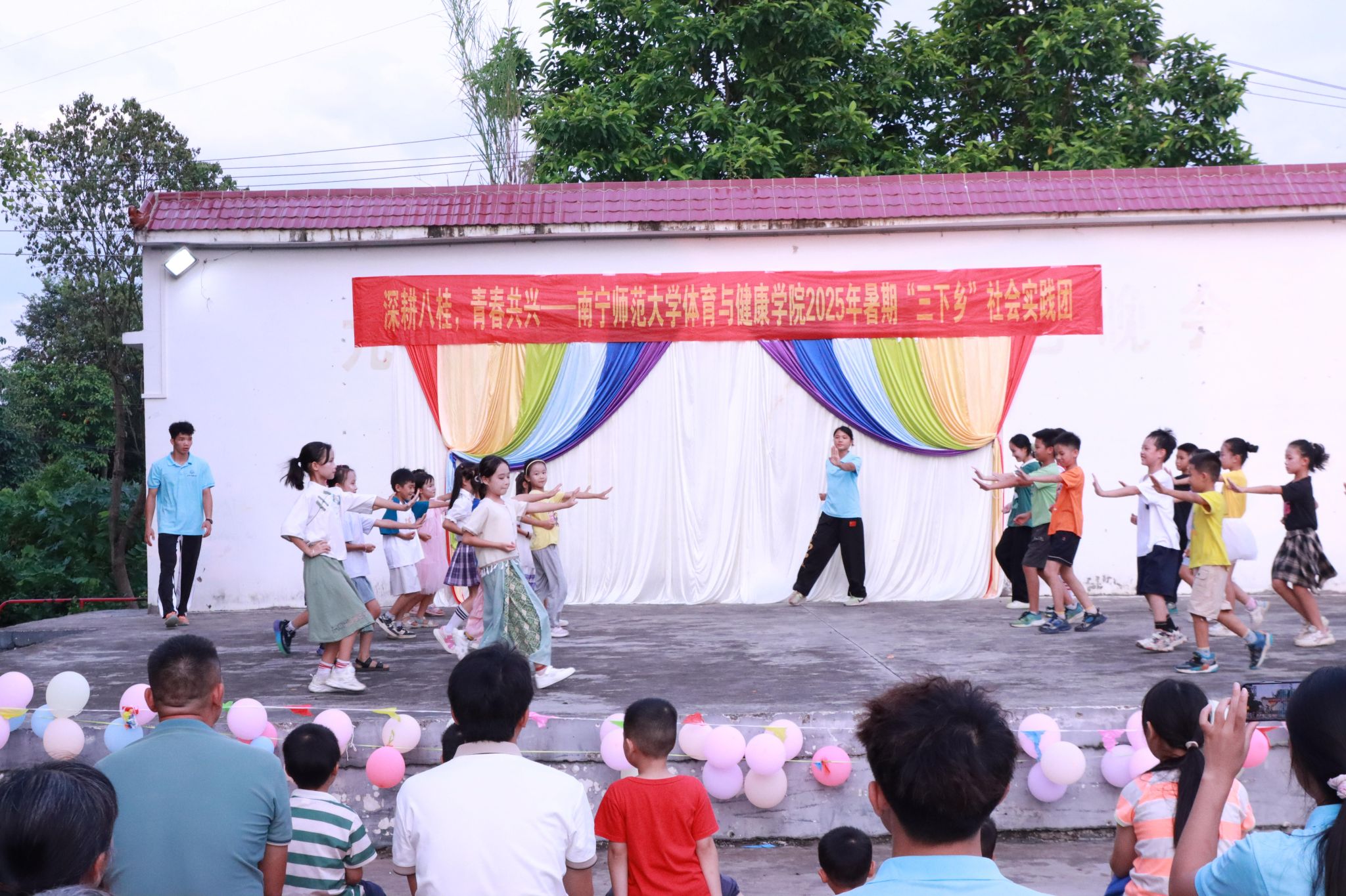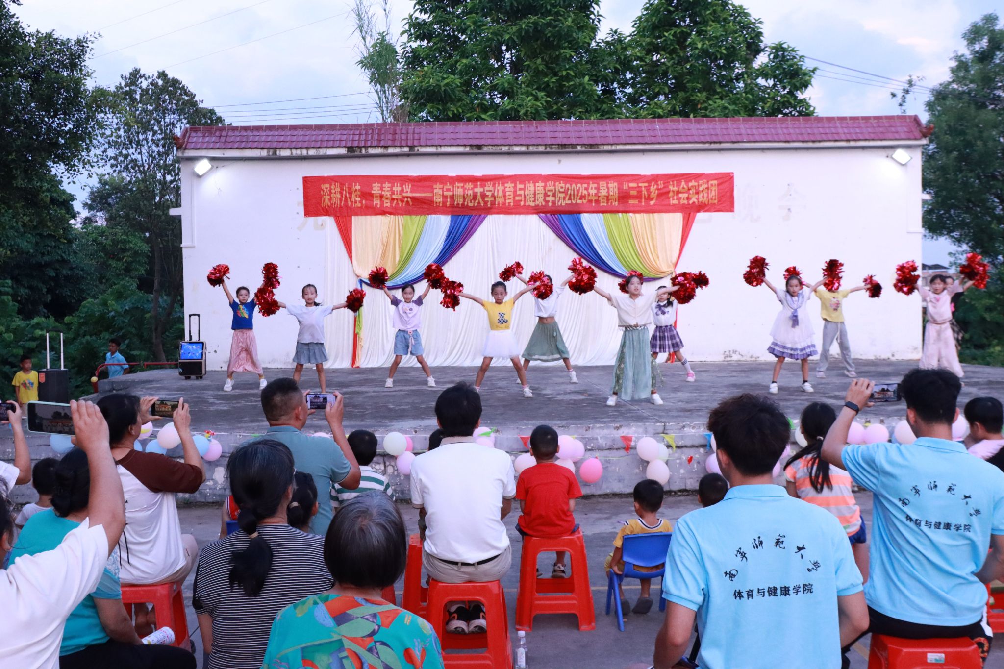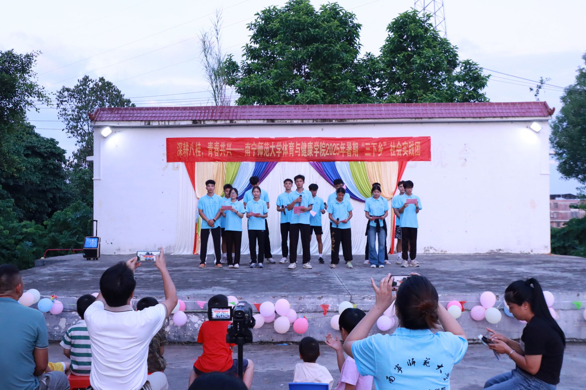 为助力乡村振兴,丰富乡村精神文化生活,7月20日,黄色短视频 “体健赋能·壮韵九联”实践团在南宁市武鸣区九联村村委会广场开展暑期“三下乡”社会实践活动汇报演出。学院党委副书记陈军弟,团委书记农梦莲到场,由实践团队员伍南舟、马林主持,实践团全体队员和九联村小学生参加。