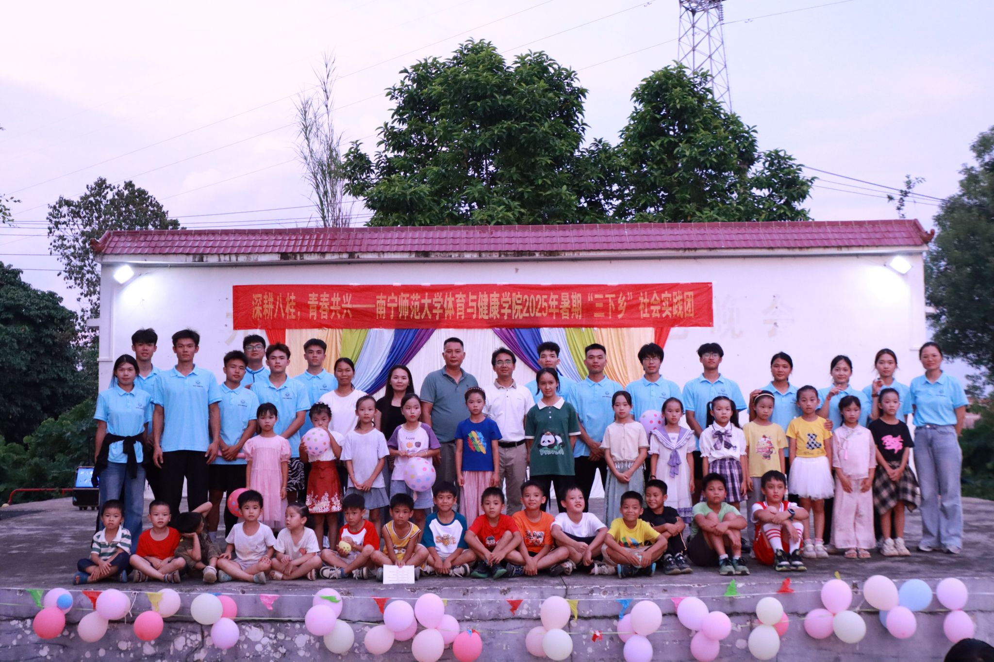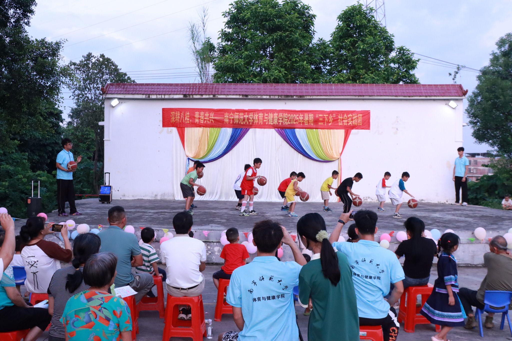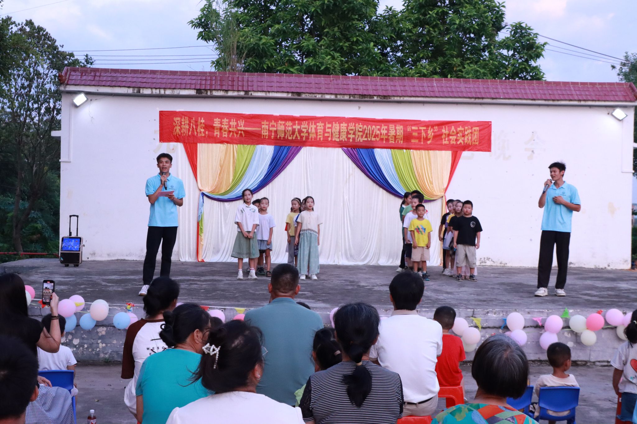 为助力乡村振兴,丰富乡村精神文化生活,7月20日,黄色短视频 “体健赋能·壮韵九联”实践团在南宁市武鸣区九联村村委会广场开展暑期“三下乡”社会实践活动汇报演出。学院党委副书记陈军弟,团委书记农梦莲到场,由实践团队员伍南舟、马林主持,实践团全体队员和九联村小学生参加。