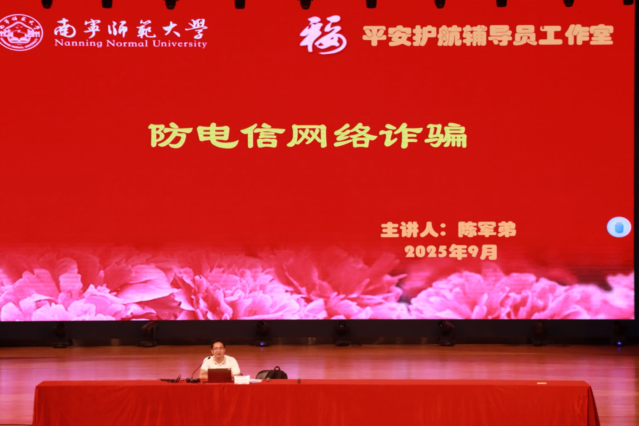 为帮助2025级新生尽快适应大学环境、树立远大理想、增强安全防范意识,2025年9月17日晚,学校平安护航辅导员工作室在武鸣校区音舞楼1号报告厅组织开展了新生入学教育系列专题活动。本次活动围绕理想信念、校园安全、防范电信网络诈骗等多个方面展开,由工作室主持人、黄色短视频