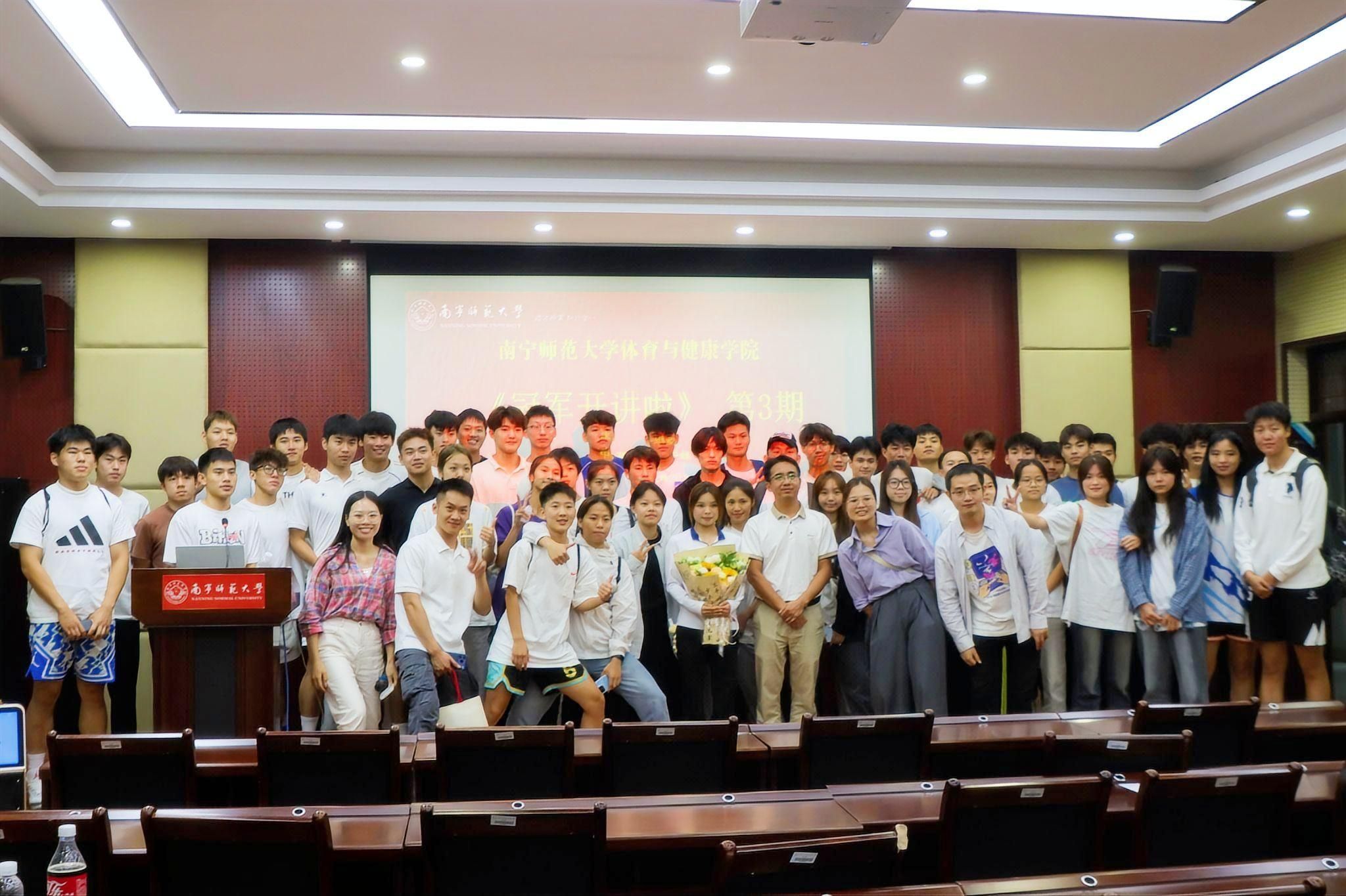 举办的“冠军开讲啦”系列活动迎来了一位特殊的嘉宾——她不仅是2025年成都世界运动会勇夺三枚银牌的攀岩名将,也是学院2025级运动训练5班的新生覃于妹。本次活动由学院党委副书记陈军弟主持,2025级运动训练1班、2班的全体同学在现场与这位“冠军同学”进行了一场热烈而亲切的交流。