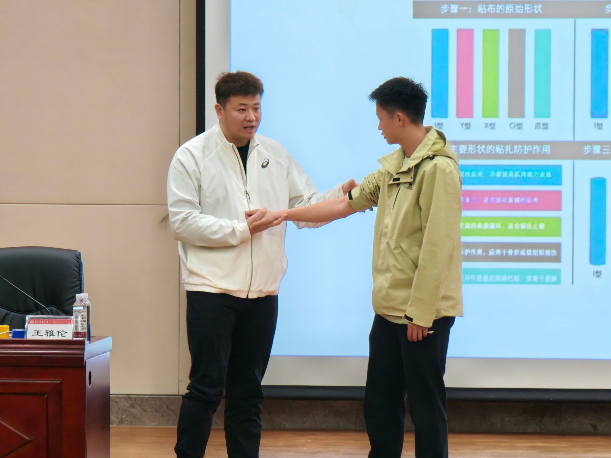 理论讲解结束后,王雅伦老师现场进行了肌效贴和弹力绷带包扎实操教学,详细演示了Y型、灯笼型肌贴的裁剪与贴扎方法,以及环形包扎、螺旋包扎、“8”字包扎等标准操作技巧,并对缠绕力度、固定要点、适用场景及注意事项逐一说明。在随后的分组练习中,王老师逐组指导、耐心纠错,帮助同学们迅速掌握加压包扎、关节固定等实用急救技能。